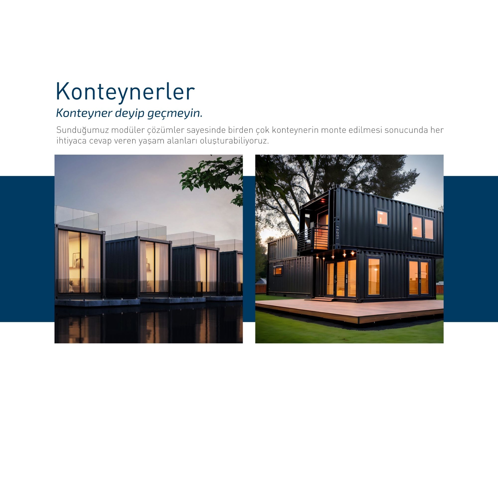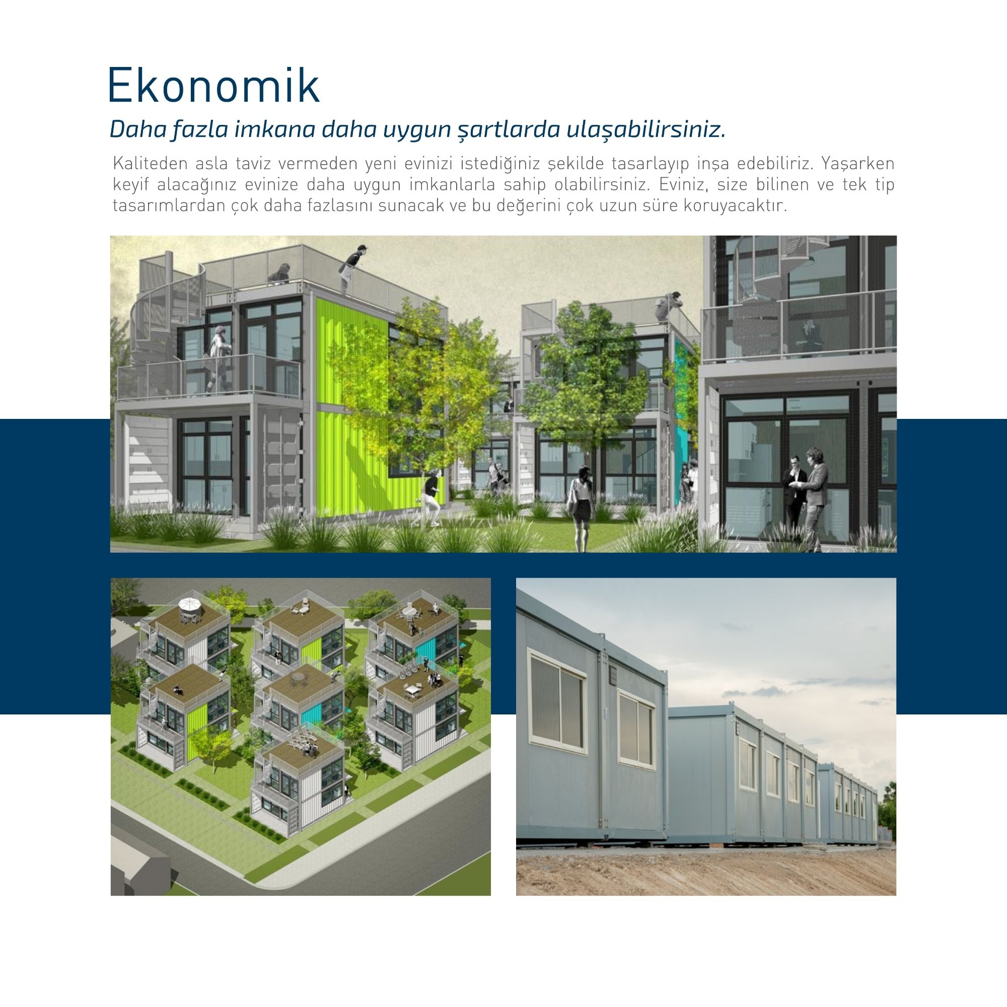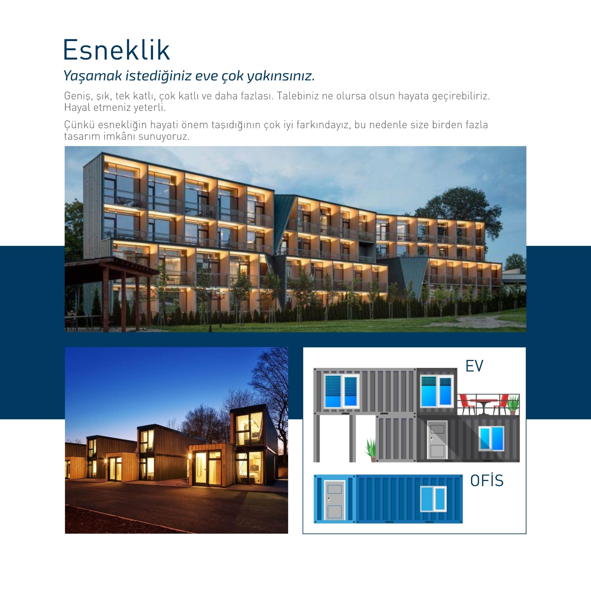 Konteynerler, istenildiği gibi istiflenebilen ve birleştirilebilen bir birim olarak tek bir konteyner ile mimarlara birçok tasarım imkânı sağlar. Modüler bir birim, bütün bir oda veya birkaç odaya büyük bir odanın bir parçası olabilir. İstenilen uzunlukta ve genişlikte monte edilip birleştirilebilir, üç kat halinde istiflenebilir ve çatı, teras vb. mahaller ile dekore edilebilir.