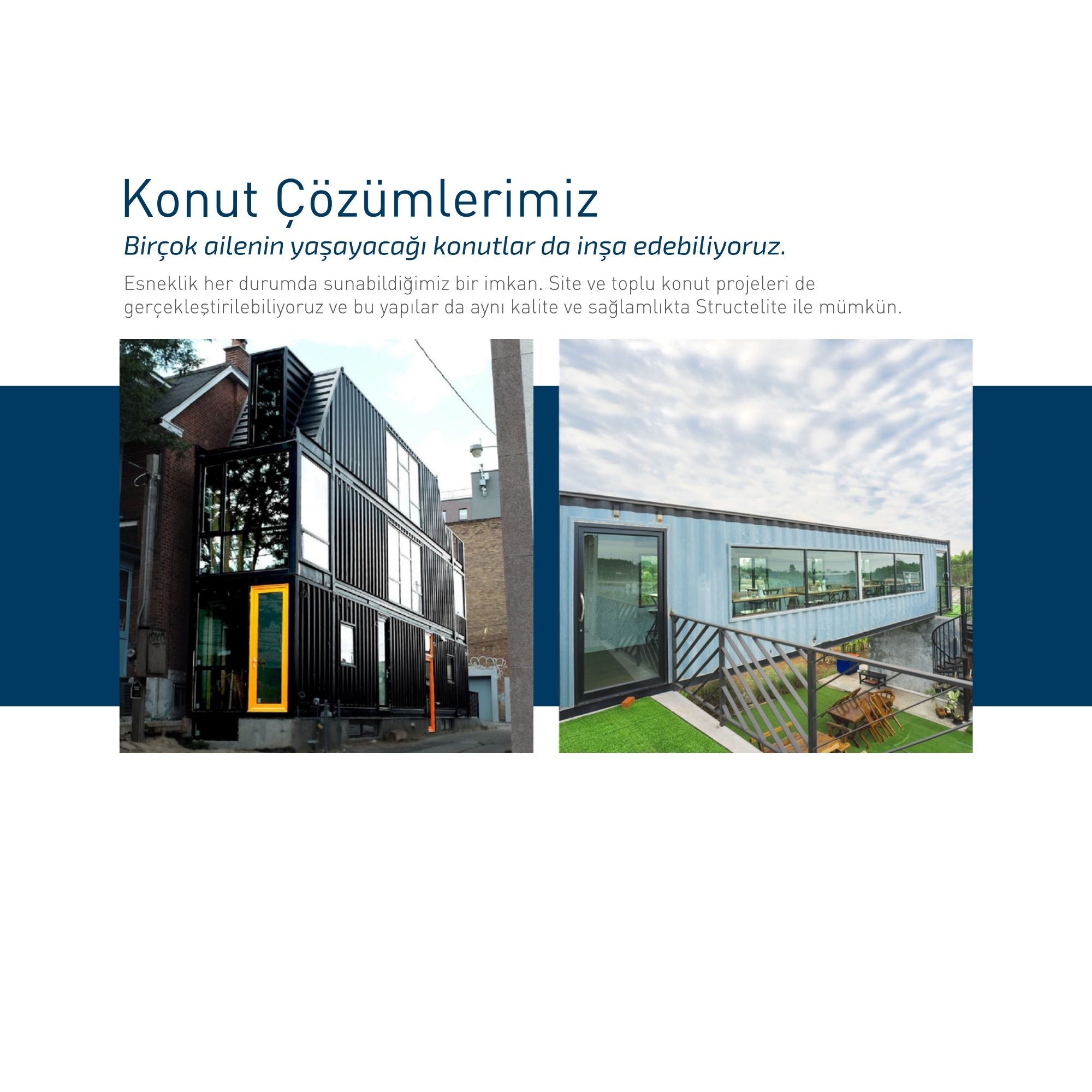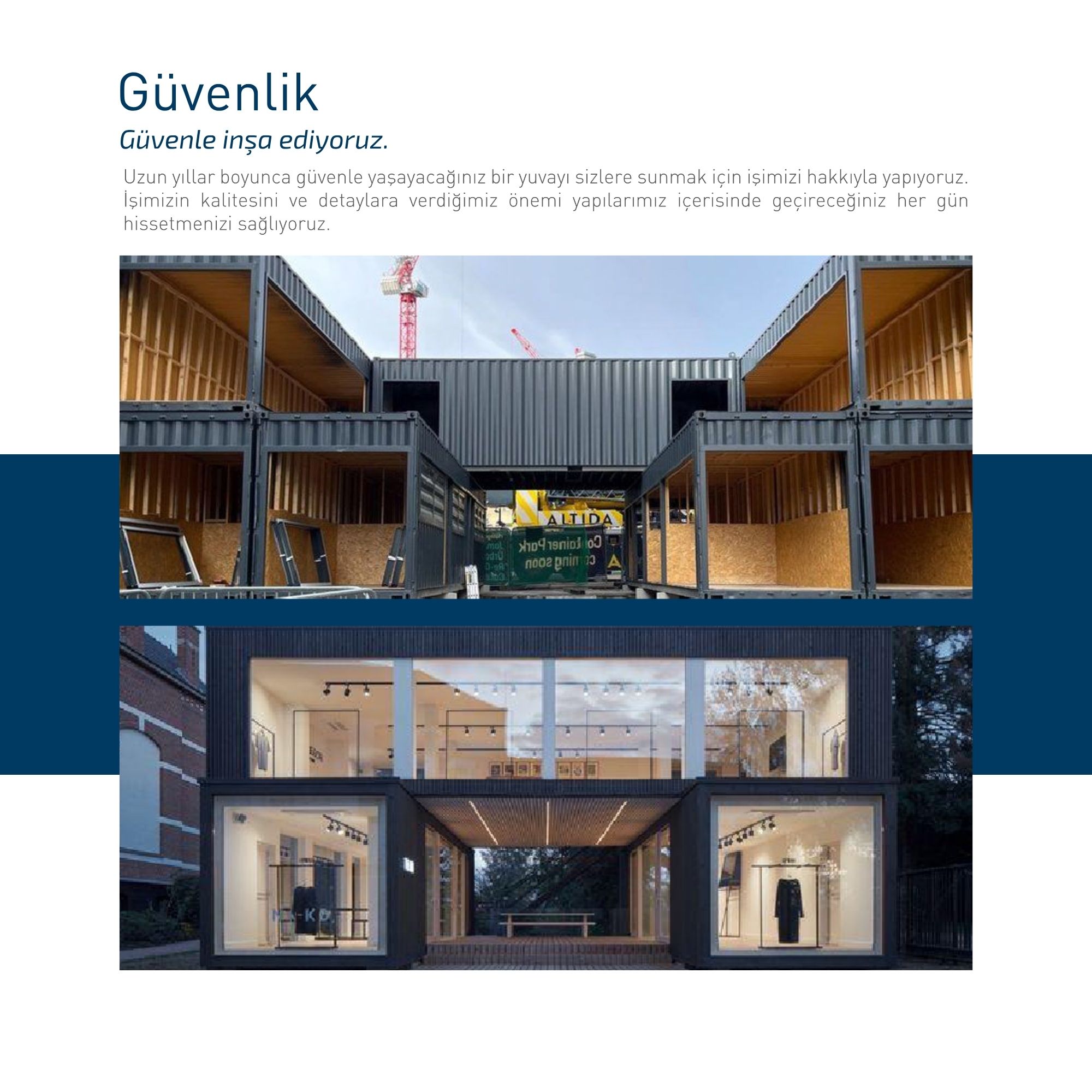 Eşsiz bir test tezgahı, konteynerin yapısal dayanıklılığını mekanik olarak test eder. Yapı, 120 km/saat rüzgar yükü, 100 kg/m² kar yüküne dayanıklıdır ve 20 yıldan fazla hizmet ömrü sunmaktadır. Daha güçlü şok karşıtı, basınç karşıtı, ısı yalıtımı, ses yalıtımı, yanmaz, su geçirmez, kar geçirmez ve kullanım ihtiyaçlarına göre kalıcı veya yarı kalıcı yapılar inşa edilebilme imkanı sunmaktadır.