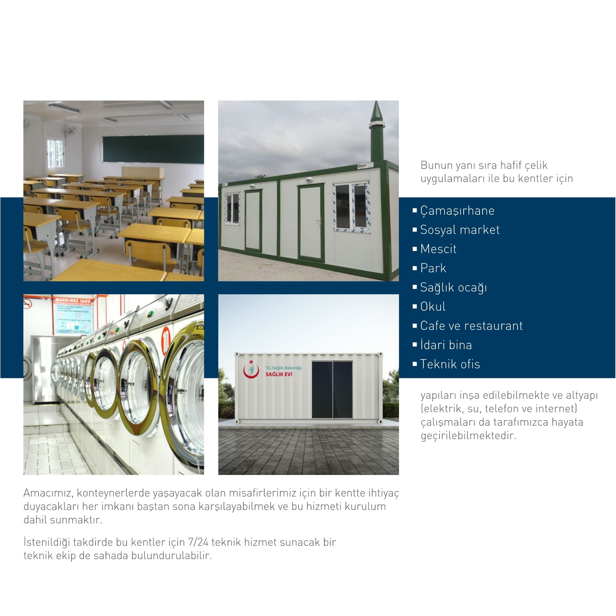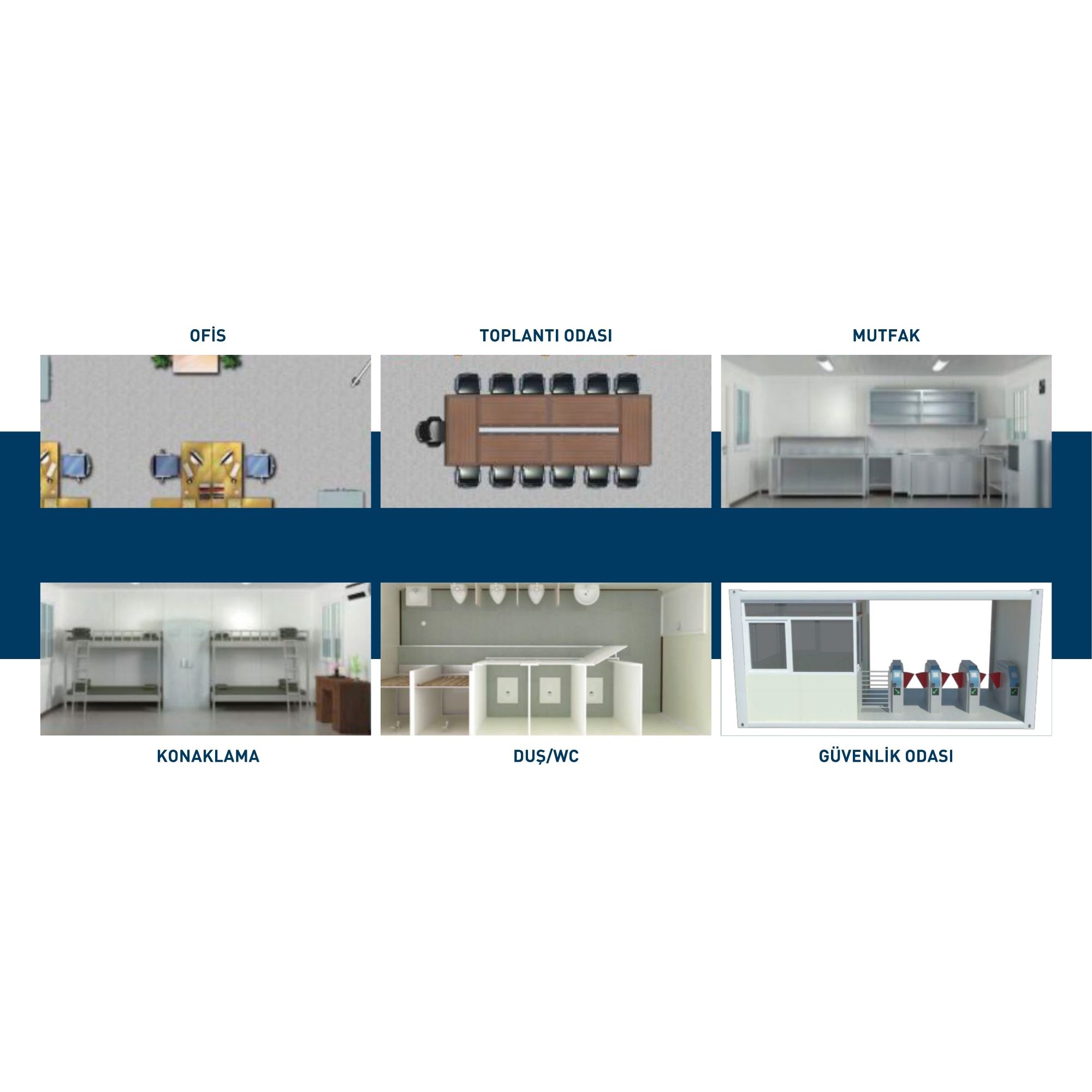 Konteyner, ofis, konaklama, fuaye, tuvalet, mutfak, restoran, eğlence odası, konferans salonu, klinik, çamaşır odası, depo, komuta merkezi vb. gibi çeşitli fonksiyonel birimlere ve farklı ihtiyaçlara göre tasarlanabilir.